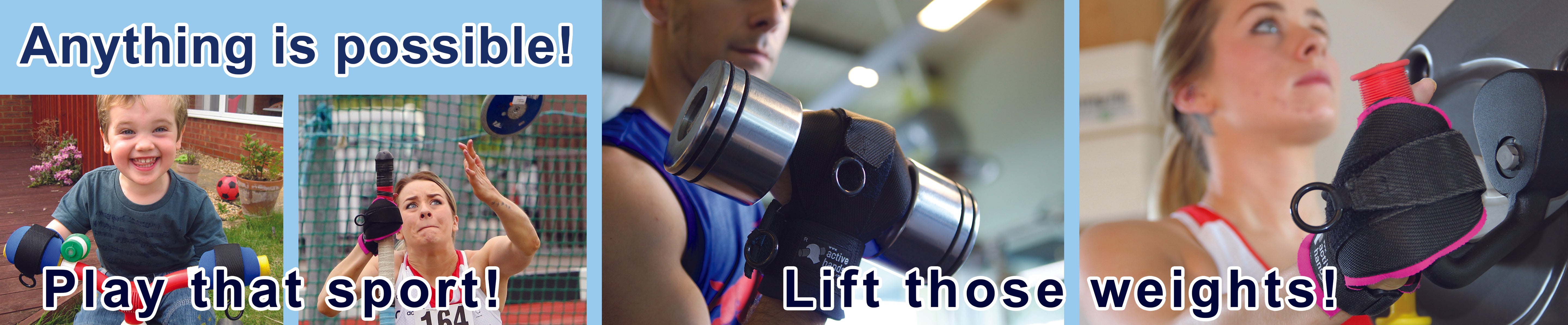 The Active Hands gripping aids gently, yet firmly hold your hand into a gripping shape enabling you to hold tightly onto objects from hammers to garden tools; gym equipment to drumsticks; ski-outriggers to boat tillers; adaptive bike handles to musical instruments; and many more.