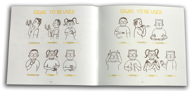 Within the story you will find reference to farmyard animals, such as a rooster, dog, duck, goose etc. For Keywords within the story a small picture of the Auslan sign follows the word. On the back page you will find larger versions of all the signs included throughout the story.